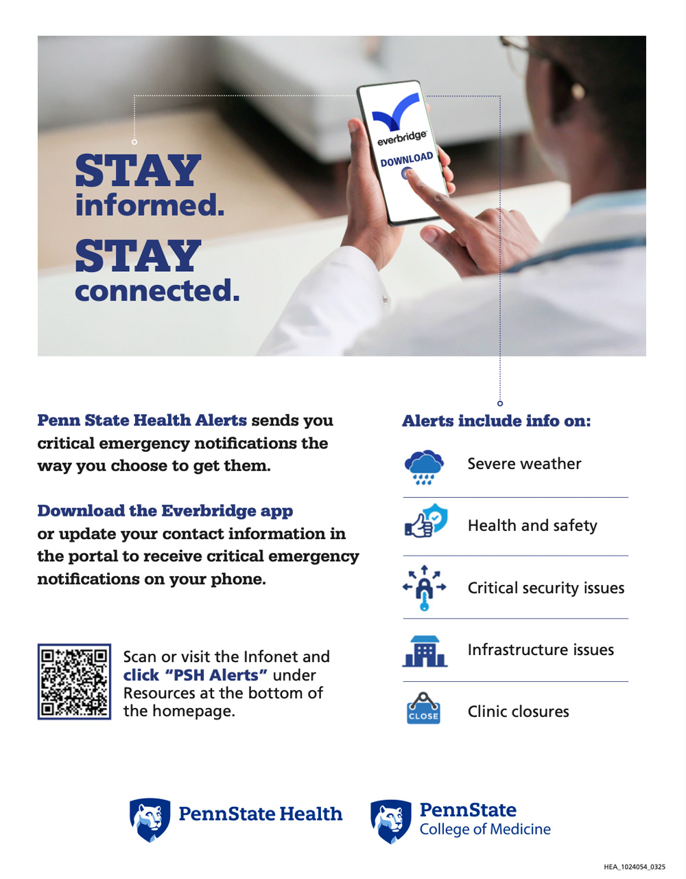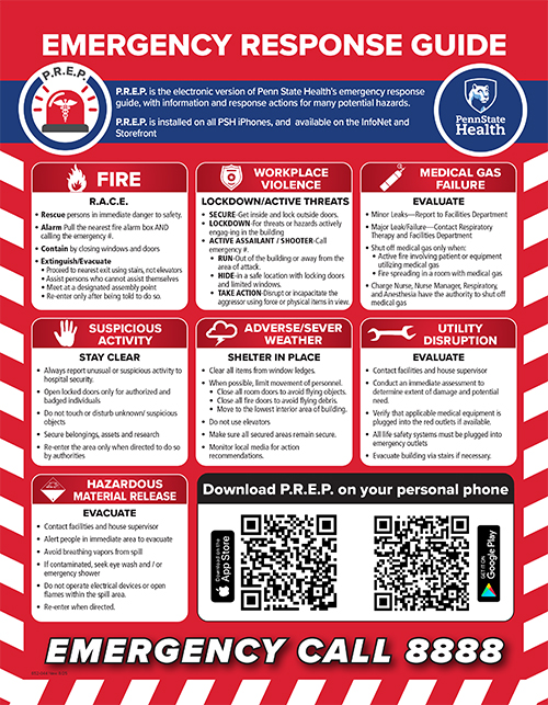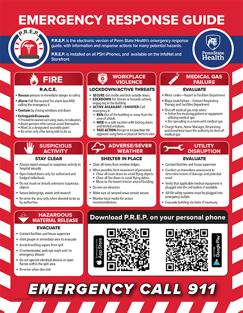 Designed to support staff across Penn State Health and students and faculty at the College of Medicine, these posters outline clear steps—such as evacuation, shelter-in-place, or lockdown procedures—and emphasizes calling the appropriate emergency number in critical situations.
